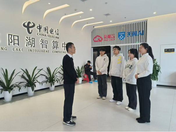 九江电信鄱阳湖智算中心是九江数字经济发展的核心枢纽,也是江西省“东数西算”战略布局的重要节点,承载着推动区域数字产业升级、赋能传统产业转型的重要使命。在调研过程中,中心技术人员围绕智算中心的建设理念、算力架构、应用场景等内容进行详细讲解,带领师生们实地参观了算力调度中心等区域。通过直观的设备展示、生动的案例分析,师生们深入了解了智算中心在人工智能训练、工业互联网赋能、政务数据治理等领域的实践成果,对算力作为新质生产力的核心要素如何重塑产业发展格局、驱动经济高质量发展,有了更加深刻和具体的认知。